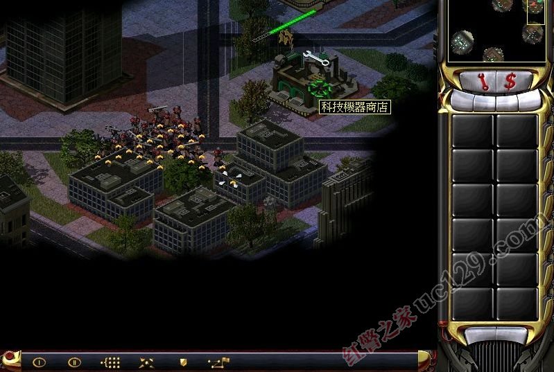 开局,这个科技商店别打掉了。。等下回来占领。你现在只有一个工程师。你想现在占领也可以。那后面那个兵营就没工程师去占领了,只能等到你手里的兵打下三个出暴民的点之后会给你基地车。